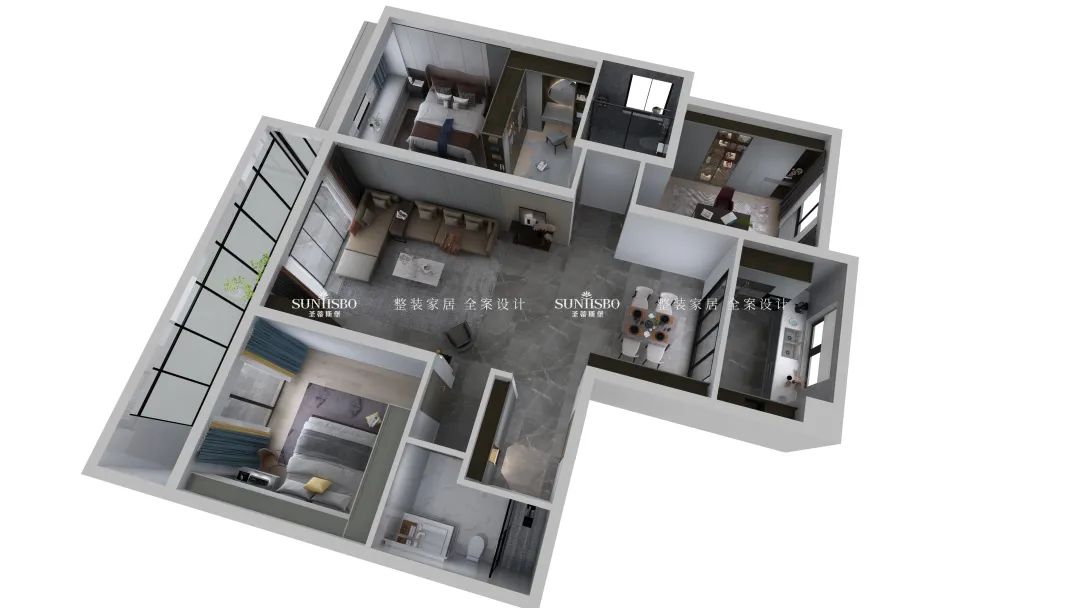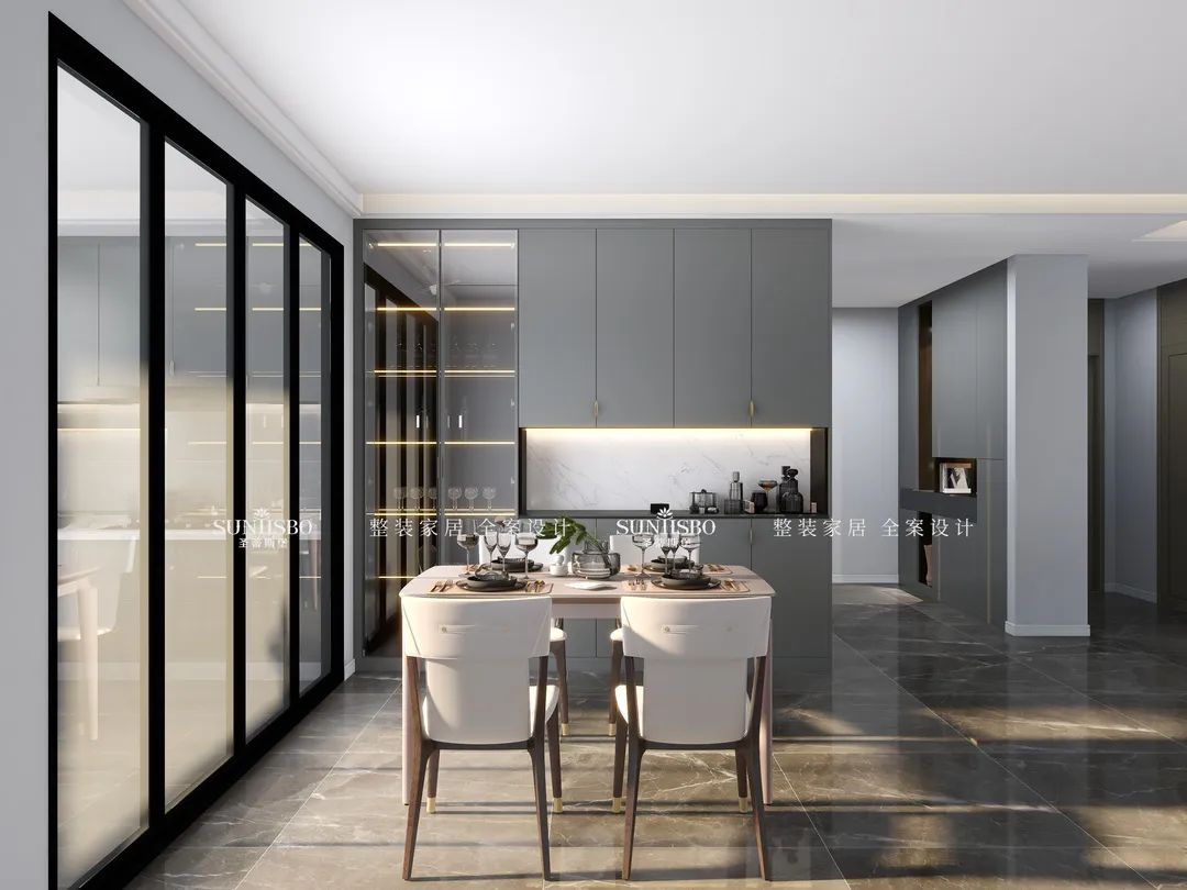 餐廳的設(shè)計(jì)采用整墻定制的餐邊柜,高級(jí)灰讓空間調(diào)性瞬間得到提升,半透明的玻璃展示區(qū),營(yíng)造了多樣的空間和充滿極簡(jiǎn)藝術(shù)氣息的生活體驗(yàn)。