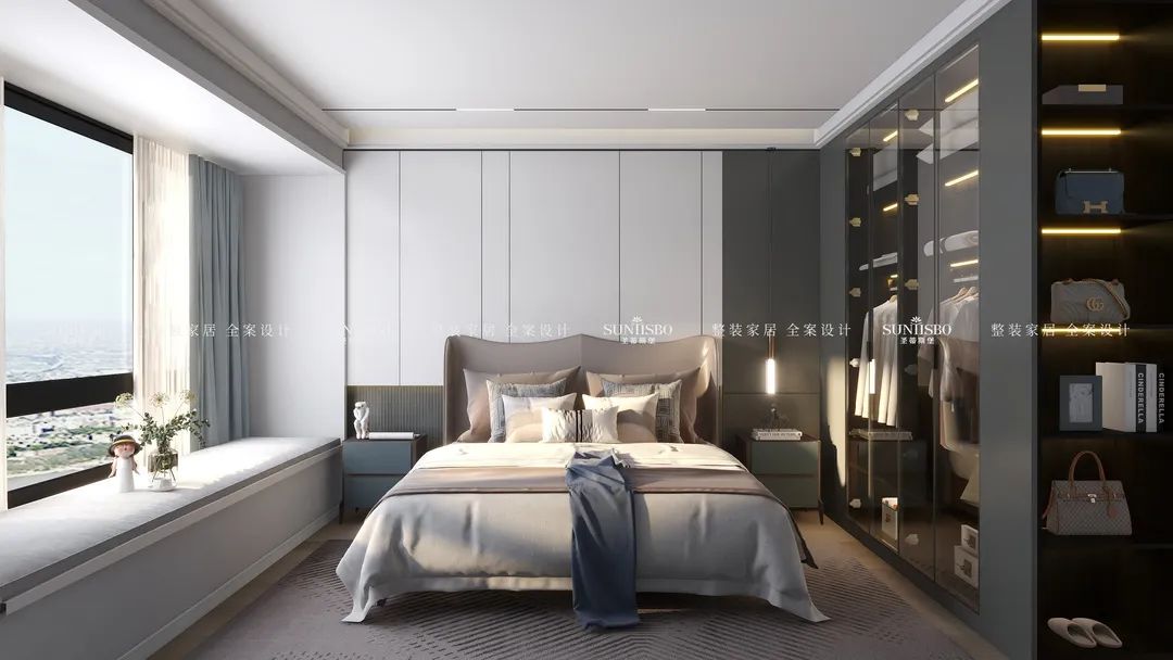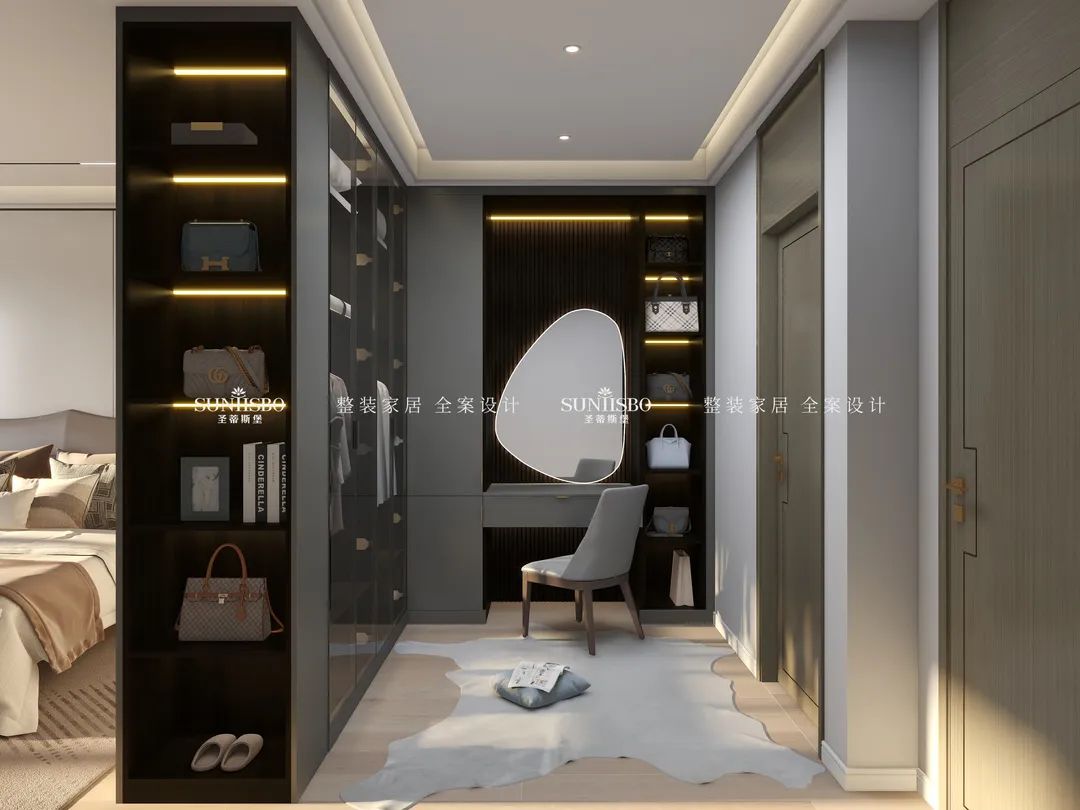 擁有一個(gè)專(zhuān)屬衣帽間是很多女生的夢(mèng)想。設(shè)計(jì)師回歸生活本質(zhì),究其外,是空間;究其內(nèi),是材質(zhì)、燈光,內(nèi)外融合,比例和諧。通過(guò)不規(guī)則狀的玻璃鏡面設(shè)計(jì),在時(shí)尚高級(jí)的定制空間中,傾訴著創(chuàng)意的真實(shí)和溫度,不僅擴(kuò)大了衣帽間視覺(jué)范圍,同時(shí)也給予了空間個(gè)性鮮明的藝術(shù)格調(diào)。